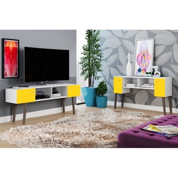 rack tv mueble aparador patas blanco amarillo moderno sala dormitorio soporte televisor organizador madera diseño