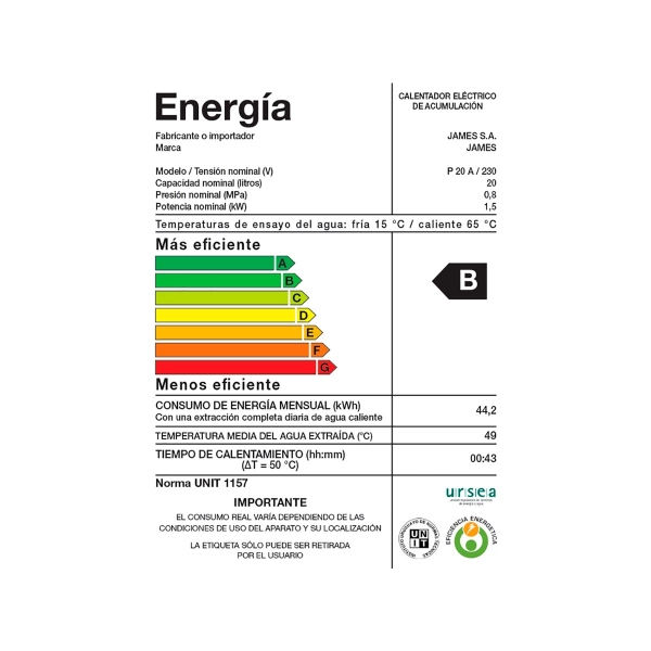 Especificaciones Termotanque James Prisma 20: