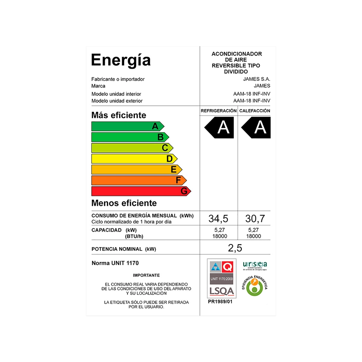 Aire Acondicionado James 9.000 BTU 1300W