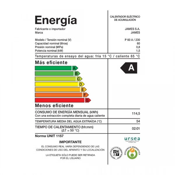 Calefón James 60L eficiente tanque acero tecnología avanzada ahorro energético calentamiento rápido ideal para hogar confort.