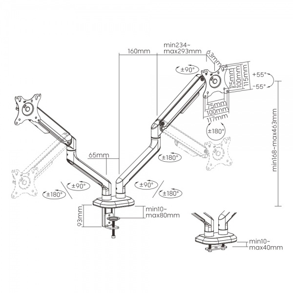 Angulo de giro: +90º / -90º