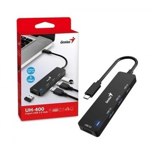 Genius UH-400 ofrece 4 puertos USB 3.0 para ordenadores mediante conector USB tipo C. Puede utilizar estos puertos adicionales para transmitir datos o conectar dispositivos USB incluso si su computadora no tiene suficientes puertos USB.