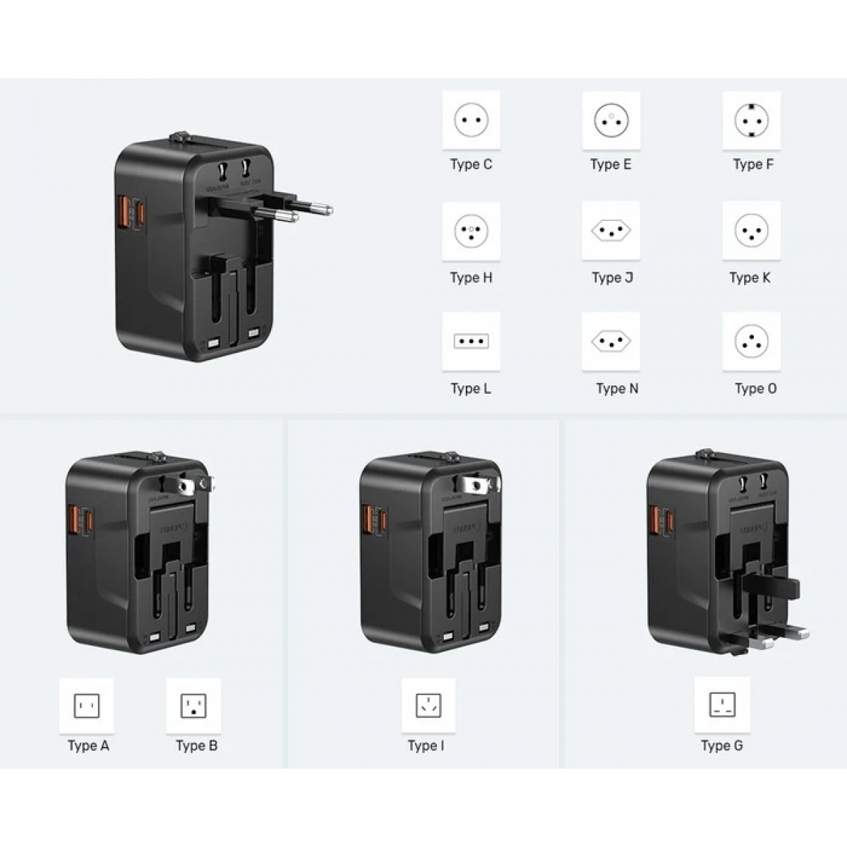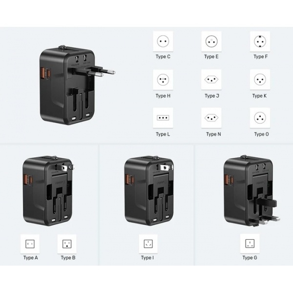 cargador universal unitek 20w usb c pd usb a qc3.0 adaptador viaje carga rapida internacional celular tablet enchufe multi pais
