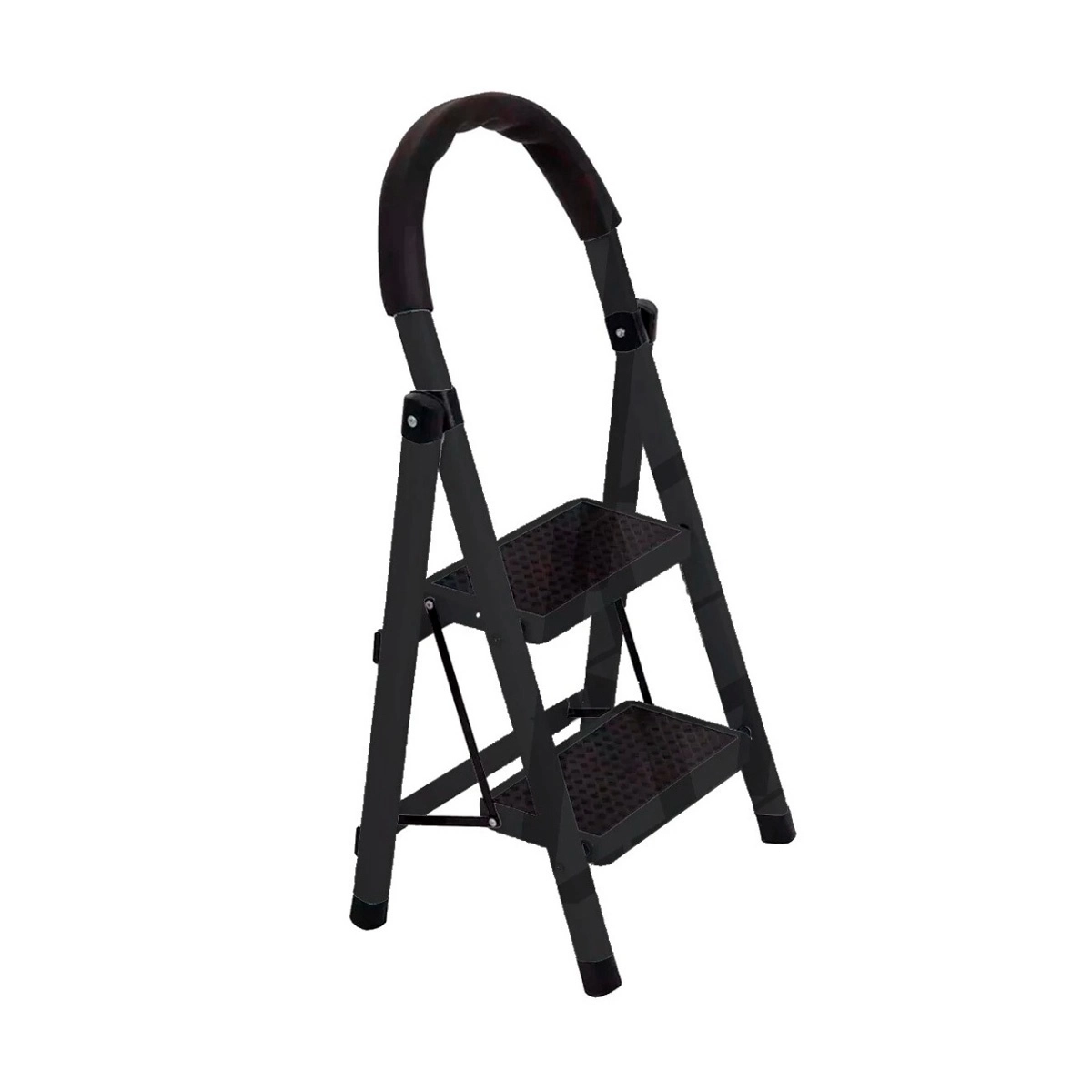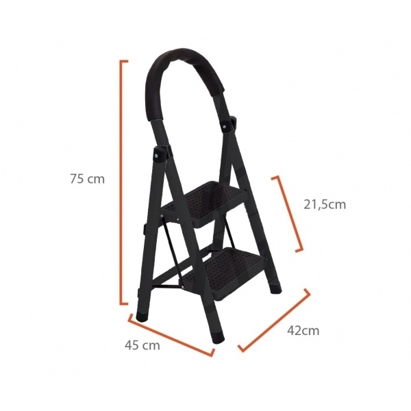 Escalera de 2 escalones negra ideal para tareas domésticas y de oficina. Fabricada en metal resistente, cuenta con base antideslizante y diseño compacto para fácil almacenamiento. Perfecta para alcanzar lugares altos de forma segura.